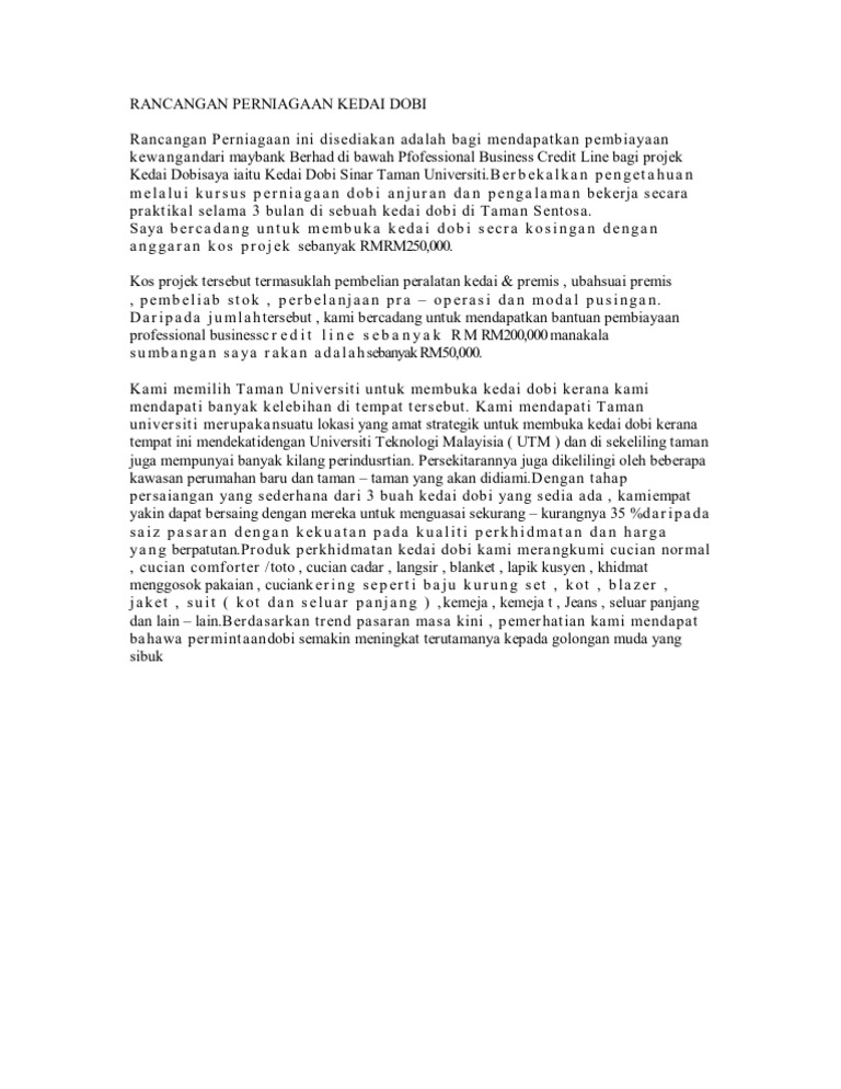 Download View Rancangan Perniagaan Kedai Dobi as PDF for free. Tujuan Rancangan Perniagaan ini disediakan adalah untuk mendapatkan kemudahan pembiayaan sebanyak RM200000 dari Skim Pembiayaan dikelolakan oleh agensi pembiayabank bagi membiayai pembelian peralatan ubahsuai premis pembelian stok perbelanjaan pra-operasi dan modal pusingan bagi membuka Kedai Dobi saya di lokasi. Sediakan dokumen seperti rancangan perniagaan dan lain untuk memenuhi syarat-syarat pinjaman perniagaaan dari bank atau organisasi lain.